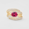 anello a 4 file in oro rosa con tormalina rosa centrale taglio ovale e pavé di diamanti taglio brillante